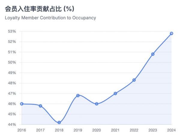 基于各大酒店集團(tuán)公開數(shù)據(jù)統(tǒng)計(jì),2024年忠誠(chéng)度會(huì)員貢獻(xiàn)了酒店已售客房總數(shù)的52.8%,高頻會(huì)員貢獻(xiàn)了約58.4%的間夜量。