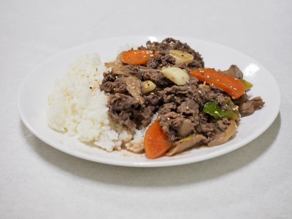 蓋澆飯:將炒好的牛肉和蔬菜蓋在煮熟的米飯上,可以根據(jù)個人喜好的比例調(diào)整牛肉和蔬菜的分量。