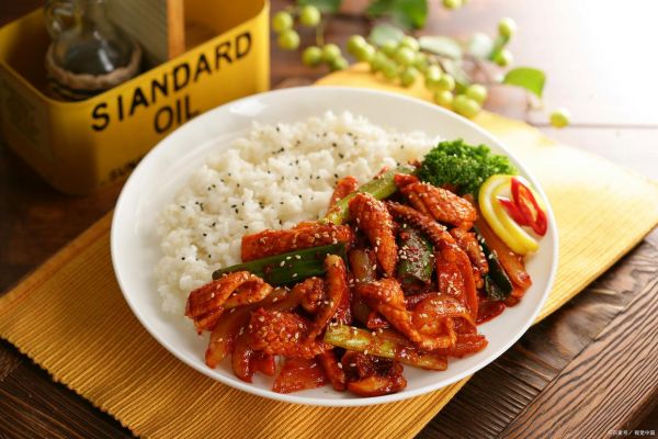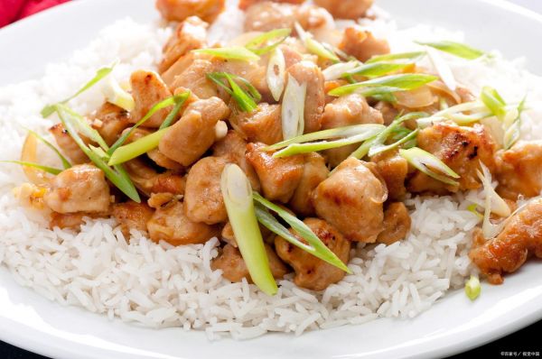 蓋澆飯:將炒好的雞肉和蔬菜蓋在煮熟的米飯上,可以根據(jù)喜好的比例調(diào)整雞肉和蔬菜的分量。