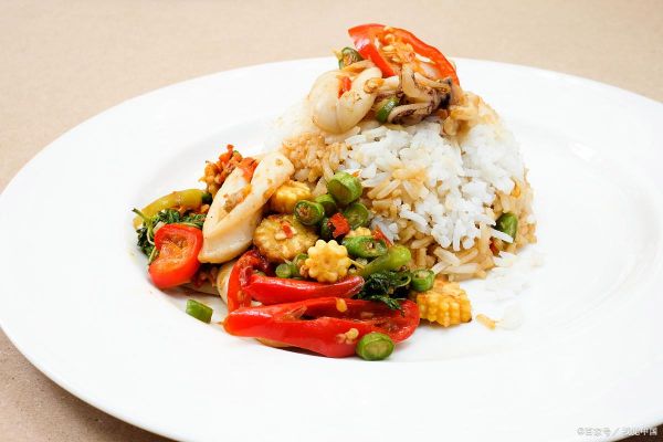 蓋澆飯:將炒好的海鮮和蔬菜蓋在煮熟的米飯上,可以根據(jù)喜好的比例調(diào)整海鮮和蔬菜的分量。