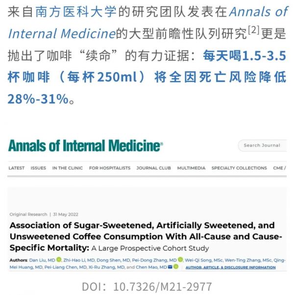 [2]Liu D, Li ZH, Shen D, Zhang PD, Song WQ, Zhang WT, Huang QM, Chen PL, Zhang XR, Mao C. Association of Sugar-Sweetened, Artificially Sweetened, and Unsweetened Coffee Consumption With All-Cause and Cause-Specific Mortality : A Large Prospective Cohort Study. Ann Intern Med. 2022 May 31. doi: 10.7326/M21-2977. Epub ahead of print. PMID: 35635846.