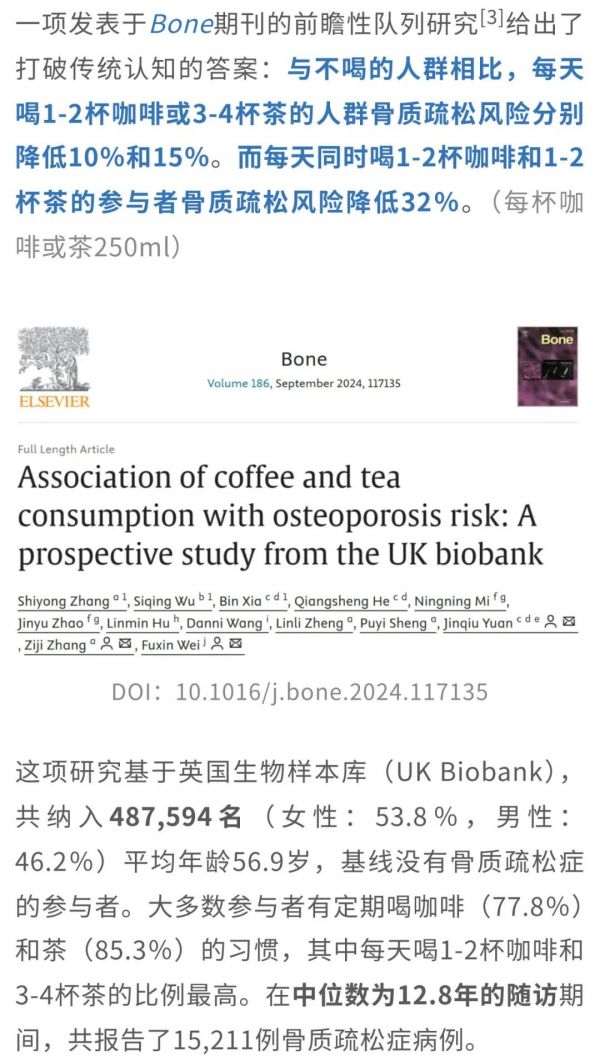 [3]Zhang S, Wu S, Xia B, He Q, Mi N, Zhao J, Hu L, Wang D, Zheng L, Sheng P, Yuan J, Zhang Z, Wei F. Association of coffee and tea consumption with osteoporosis risk: A prospective study from the UK biobank. Bone. 2024 Sep;186:117135. doi: 10.1016/j.bone.2024.117135. Epub 2024 May 29. PMID: 38821386.