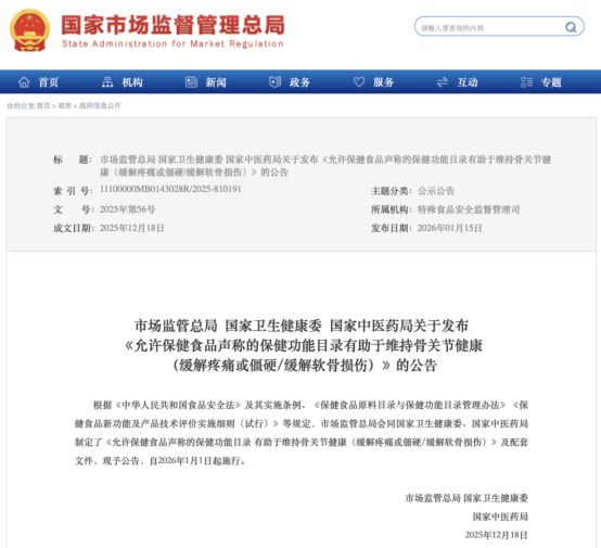 2026年1月16日,國家市場監(jiān)管總局、國家衛(wèi)健委、國家中醫(yī)藥局聯(lián)合發(fā)布《允許保健食品聲稱的保健功能目錄有助于維持骨關(guān)節(jié)健康(緩解疼痛或僵硬/緩解軟骨損傷)》的公告,該政策自2026年1月1日起施行,其中新增的“有助于維持骨關(guān)節(jié)健康(緩解疼痛或僵硬/緩解軟骨損傷)”功能備受關(guān)注。
