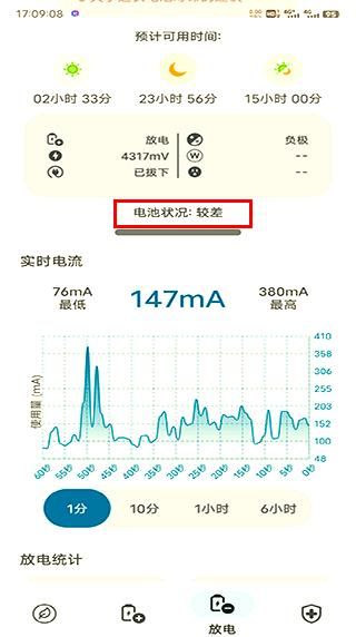 3、此外,在“放電”頁(yè)面,你可以實(shí)時(shí)查看電池的狀態(tài)以及電流的輸出情況。