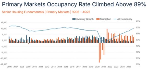 美國國家養(yǎng)老住房與護理投資中心(NIC)2026年1月的最新數(shù)據(jù),印證了這一趨勢:2025年第四季度,其追蹤的31個主要市場養(yǎng)老社區(qū)入住率升至89.1%,較上一季度增長0.4個百分點,實現(xiàn)了連續(xù)18個季度攀升。這一數(shù)據(jù)背后,是嬰兒潮一代剛需的持續(xù)釋放,也是行業(yè)復蘇的明確信號。