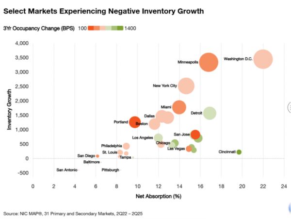 與此同時,市場分化也愈發(fā)明顯。31個主要市場中,有7個入住率超90%,比上一季度多2個;波士頓以93.1%領(lǐng)跑,舊金山和巴爾的摩緊隨其后,均達91.9%。反觀邁阿密、亞特蘭大、圣何塞,因區(qū)域供需匹配度不足,成為表現(xiàn)最差的三個市場,入住率均低于87%。