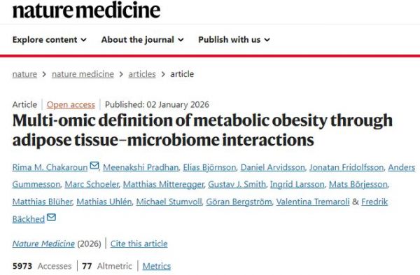 [1]Chakaroun, R.M., Pradhan, M., Bj?rnson, E. et al. Multi-omic definition of metabolic obesity through adipose tissue–microbiome interactions. Nat Med (2026). doi:10.1038/s41591-025-04009-7