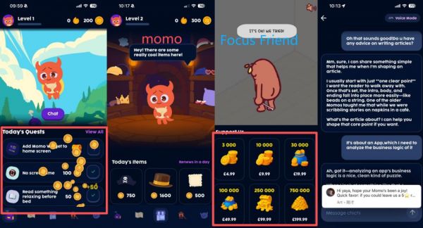 時間來到 2025 年,無論是像 Focus Friend 這樣,靠創(chuàng)始人“大網(wǎng)紅”背景迅速爆火的“編織豆子”;還是像 Self-Care Pet: Momo 這樣,來自異星球、有豐富故事的“八字眉寵物”;驅(qū)動專注的核心邏輯都是陪伴與獎勵。用戶化身“幫助者”,通過專注行為為虛擬角色(豆子、Momo 寵物)換取成長資源(編織物換家具、金幣換裝飾品)。