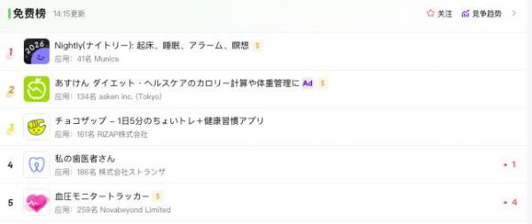 日本 iOS 健康健美下載榜,Top1 為 Nightly|圖源點點數(shù)據(jù)