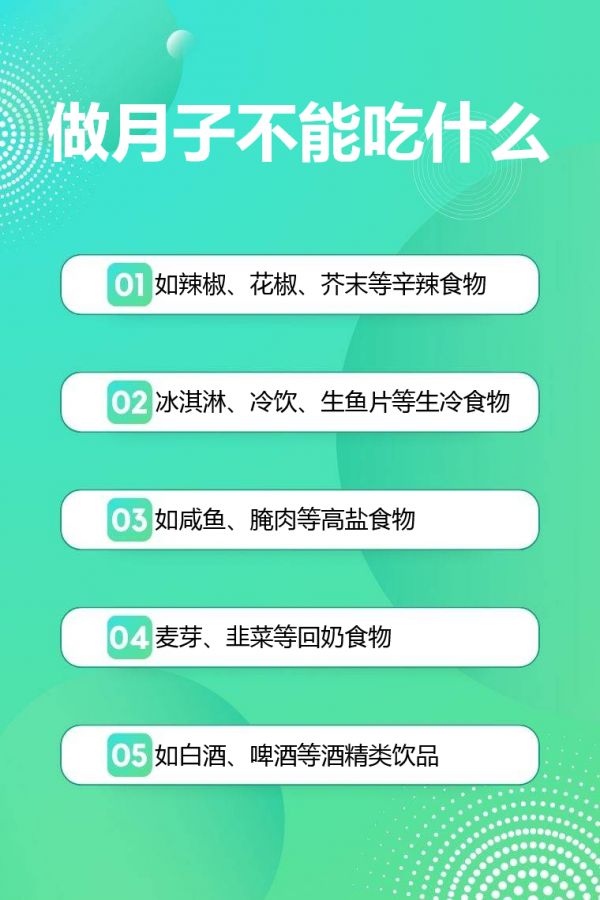 坐月子的女性不能吃辛辣食物、生冷食物、高鹽食物、回奶食物、酒精類飲品等。