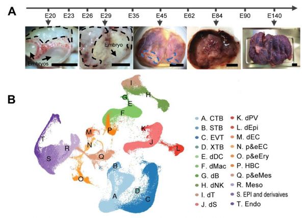 圖1. 不同發(fā)育階段獲得的代表性食蟹猴胚胎和胎盤明場圖像(A)與20種主要細胞類群(B)