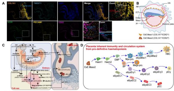 圖3.免疫熒光結(jié)果顯示ExE.Meso1(COL1A1+/TWIST1+/CDX2Lo)和ExE.Meso2(CDX2+/COL1A1Lo)在E22食蟹猴胚胎上的定位(A);模式圖展示了推定的兩種ExE.Meso的定位差異(B);模式圖顯示ExE.Meso2向成血管原細胞(Haems)分化,后向卵黃囊、胚胎和胎盤造血譜系細胞的假定分化途徑(C);模式圖根據(jù)擬時間軌跡預測和速率分析繪制胎盤HBCs、pECs、pEry來源于原始造血細胞譜系(D)