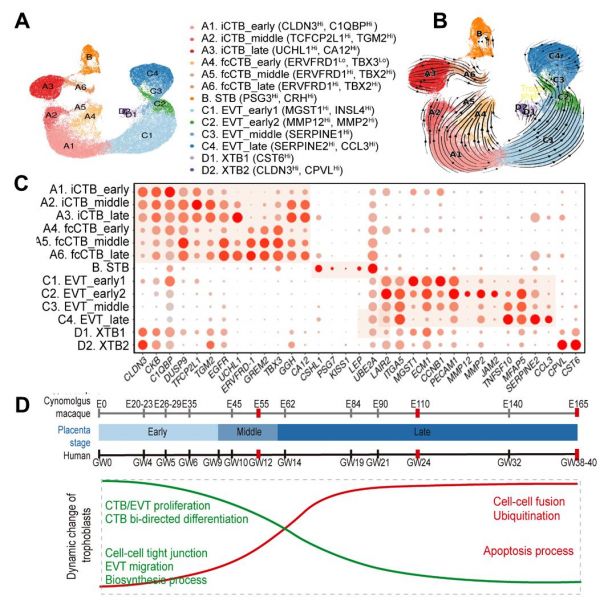 圖2. 13種滋養(yǎng)層細胞亞型的UMAP圖(A);13種細胞亞型的RNA速率分析(B);各滋養(yǎng)層亞型特異性標記基因表達(C);滋養(yǎng)層細胞在不同階段的動態(tài)功能變化(D)