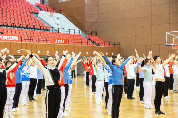 4月21日,學校第四屆教職工健康文化節(jié)開幕式暨“運動演繹精彩 健康成就未來”教工廣播體操比賽在奉賢校區(qū)體育館舉行。校黨委副書記、副校長、工會主席王瑛出席,各二級黨組織負責人、分工會主席、參賽老師約200名教工參加?;顒佑尚9?wù)副主席張淑梅主持。