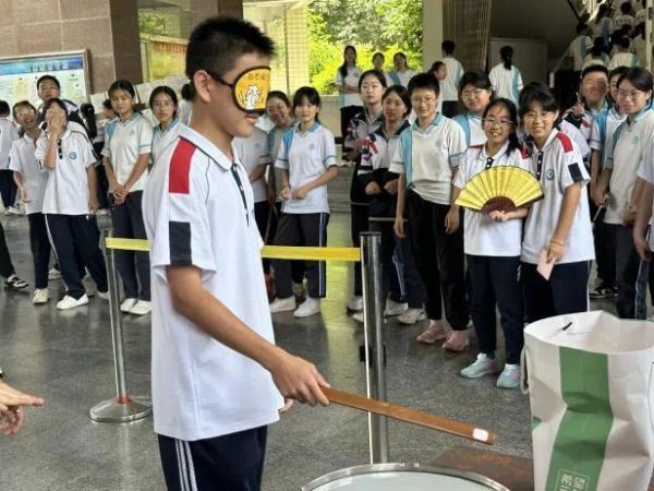 學(xué)術(shù)廳樓下的歡笑聲穿透云層。戴著眼罩的同學(xué)握著鼓棒,原地轉(zhuǎn)3圈后像小企鵝一樣搖搖晃晃往前挪,憑借方向感與勇氣朝著終點(diǎn)摸索前進(jìn)?!巴?!再走兩步!”圍觀的同學(xué)忍不住支招,當(dāng)鼓棒“咚”地敲響終點(diǎn)的鼓面,歡呼聲與掌聲瞬間炸開,拿到獎(jiǎng)品的同學(xué),眉眼彎成了盛滿星光的月牙。同學(xué)們?cè)跉g樂的氛圍中挑戰(zhàn)自我、釋放壓力,享受成功帶來的喜悅。