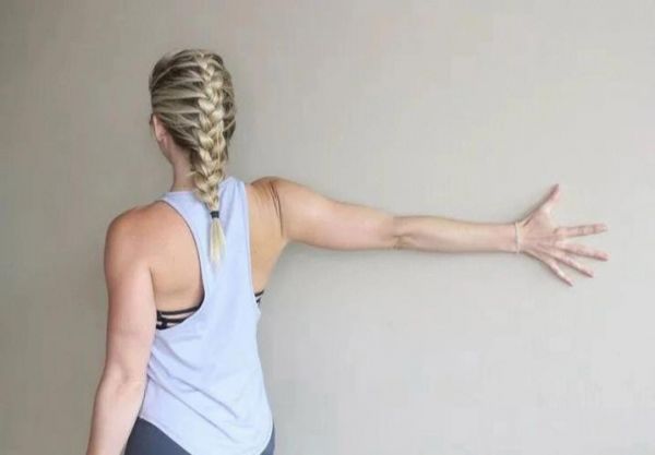 進(jìn)行肩前側(cè)拉伸,保持20秒,期間全身放松,讓肩前側(cè)有 適度的牽拉感
