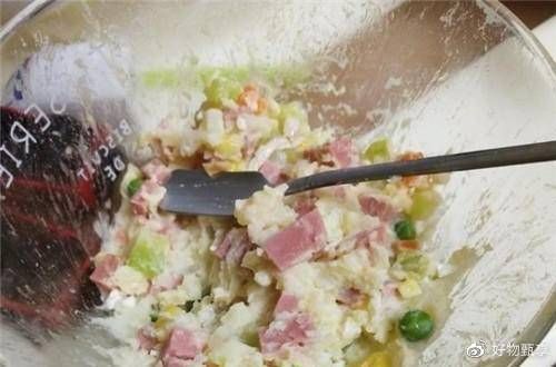 1、把土豆剝皮切小塊,在沸水中加入鹽和土豆,煮軟之后撈起來(lái)稍微瀝干水分,把土豆錘成泥狀。2、把切成小粒的青瓜粒、玉米粒、火腿粒煮熟,撈起瀝水,放入土豆泥中。3、煮倆雞蛋,撈起切碎。4、雞蛋碎放入土豆泥中,攪拌均勻,加沙拉醬,再次攪拌均勻。