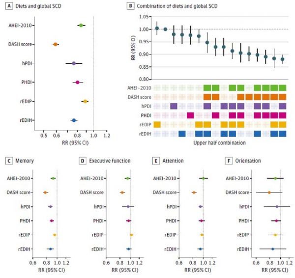 具體而言,與依從性最低的人相比,DASH飲食依從性最高的人主觀認知下降風險降低41%;hPDI飲食依從性最高的人風險降低24%;rEDIH飲食依從性最高的人風險降低24%;PHDI飲食依從性最高的人風險降低20%;AHEI-2010飲食依從性最高的人風險降低16%;rEDIP飲食依從性最高的人風險降低11%。