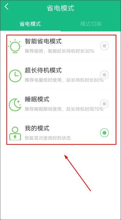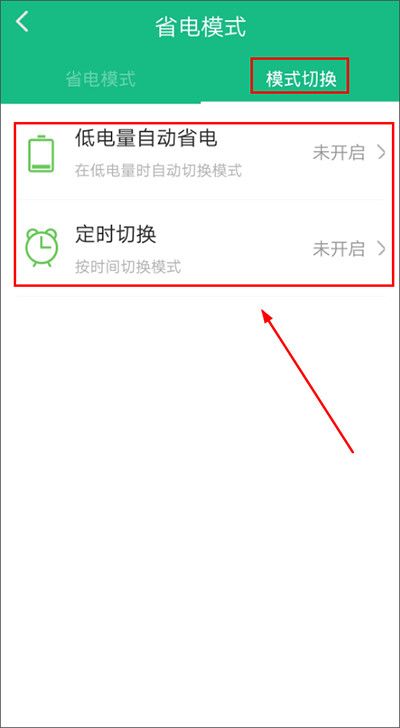 3、點(diǎn)擊【模式切換】,這里是自動設(shè)置:用戶可設(shè)置低電量自動開啟省電模式,或是定時(shí)開啟省電模式,這樣更方便用戶能長時(shí)間使用手機(jī)
