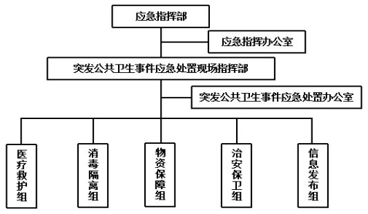 突發(fā)公共衛(wèi)生事件應(yīng)急組織機(jī)構(gòu)包括突發(fā)公共衛(wèi)生事件應(yīng)急處置現(xiàn)場指揮部、突發(fā)公共衛(wèi)生事件應(yīng)急處置辦公室及各個(gè)應(yīng)急處置工作組,在醫(yī)院應(yīng)急指揮部和應(yīng)急指揮辦公室的領(lǐng)導(dǎo)下開展應(yīng)急救援工作。