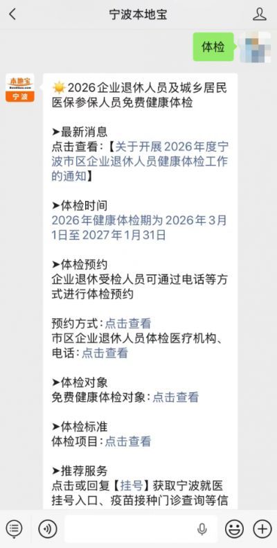 溫馨提示:關(guān)注微信公眾號(hào)【寧波本地寶】,在對(duì)話框回復(fù)【體檢】獲取2026年度寧波市區(qū)企業(yè)退休人員及城鄉(xiāng)居民醫(yī)保人員免費(fèi)體檢最新消息、免費(fèi)體檢對(duì)象、免費(fèi)體檢醫(yī)院、免費(fèi)體檢預(yù)約方式等信息!