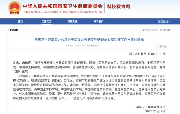 國家衛(wèi)生健康委將啟動實施為期 3 年的衛(wèi)生健康領(lǐng)域科研誠信專項治理,從加強主動監(jiān)測、強化失信行為懲戒、提升醫(yī)學(xué)期刊質(zhì)量等 8 個方面綜合采取 17 項重點任務(wù)措施。