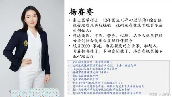 楊賽賽是全科副主任醫(yī)師、浙江大學(xué)醫(yī)學(xué)碩士,現(xiàn)任杭州星我健康管理有限公司 CEO、首席心理咨詢師,并擔(dān)任杭州蕭山七彩全愛(ài)醫(yī)院院長(zhǎng),同時(shí)為浙江省人口與健康學(xué)會(huì)第一屆職業(yè)與健康專業(yè)委員會(huì)委員。