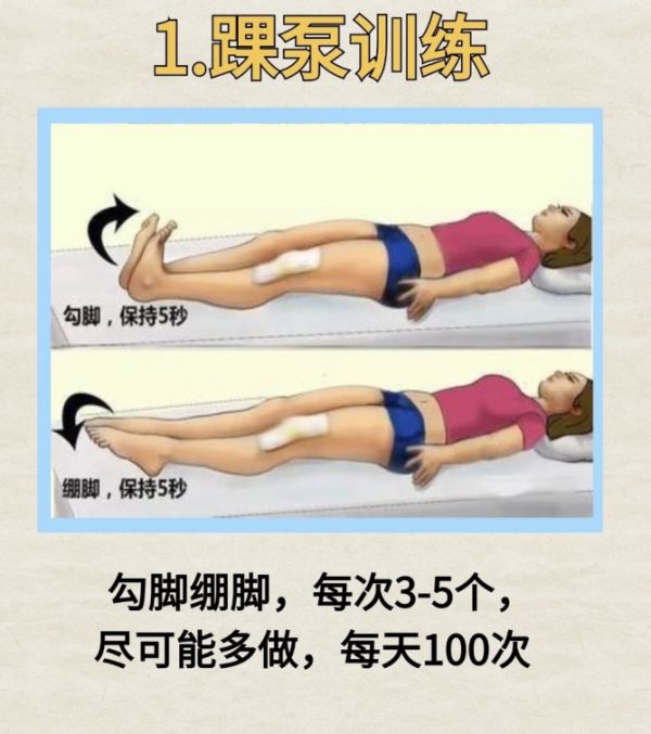 -踝泵運(yùn)動(dòng):平躺在床上,雙腳自然伸直,緩慢勾起腳尖(腳背向身體方向彎),保持一會(huì)兒后再慢慢伸直腳尖(腳掌向下壓)。重復(fù)動(dòng)作,幫助小腿血液循環(huán),預(yù)防血栓。