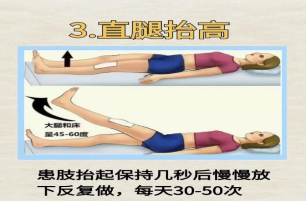 -直腿抬高:仰臥,雙腿伸直,將手術(shù)側(cè)腿緩慢抬離床面(高度根據(jù)醫(yī)生建議調(diào)整),保持幾秒后放下。鍛煉髖部和大腿肌肉,增強(qiáng)腿部力量。