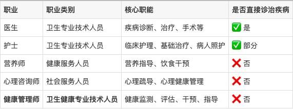 為了便于理解,我們將健康管理師與常見的醫(yī)療健康相關職業(yè)做個對比: