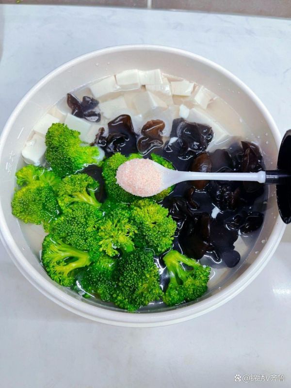 食材準(zhǔn)備:西蘭花、木耳、豆腐、姜絲。