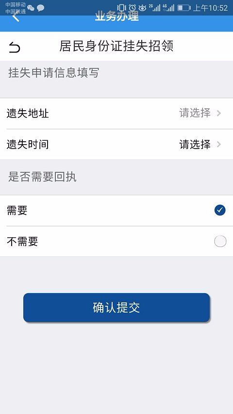 4.掛失申報。點擊“去掛失”,進入到居民身份證掛失招領界面,核實身份信息后,申領人填寫證件遺失地址、時間和選取是否需要《掛失申報回執(zhí)》后,完成掛失申報,系統(tǒng)自動跳轉到居民身份證丟失補領界面。