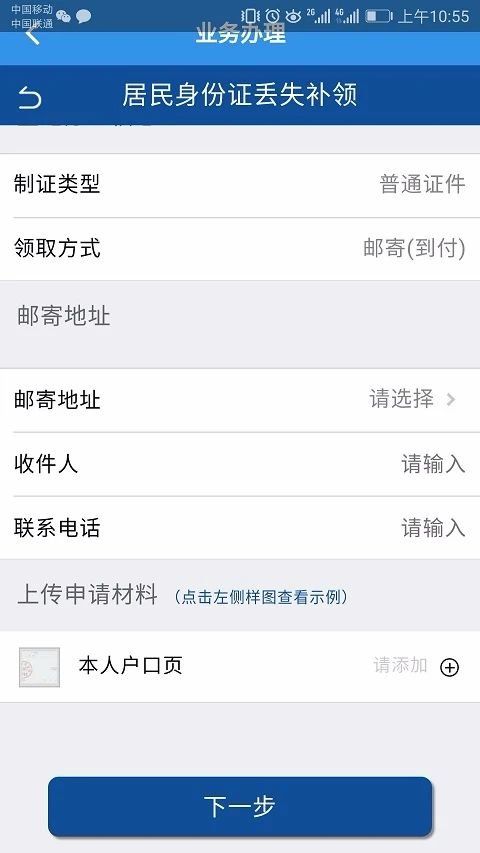 5.居民身份證丟失補領申報。申領人核實戶籍信息無誤后,填寫證件郵寄信息,上傳本人戶口頁。