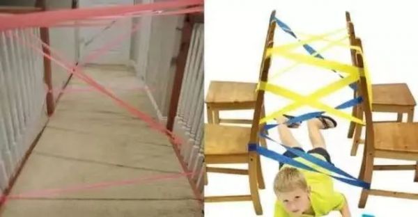 在過(guò)道或者椅子之間用膠帶搭出蜘蛛網(wǎng),要求孩子不能碰到膠帶從一頭到另外一頭。這個(gè)游戲的好處是,孩子可以往下爬,也可以往上跨。