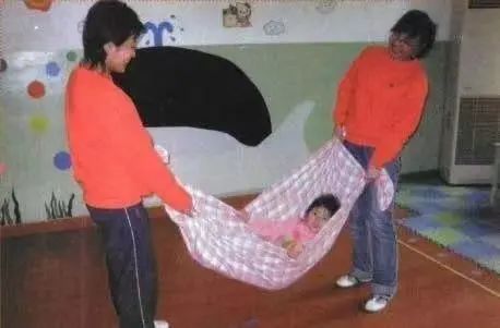 爸爸和媽媽各抓住被子的兩個(gè)角,左右晃動(dòng)寶寶。