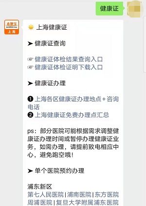 溫馨提示:微信搜索公眾號(hào)【上海本地寶】,關(guān)注后在對(duì)話框回復(fù)【健康證】可獲上海健康證體檢結(jié)果查詢?nèi)肟?、健康證下載入口、各區(qū)健康證辦理點(diǎn)+咨詢電話;還可查看單個(gè)醫(yī)院健康證體檢預(yù)約指南。