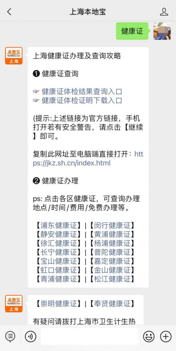 溫馨提示:微信搜索公眾號(hào)【上海本地寶】,關(guān)注后在對(duì)話框回復(fù)【健康證】可獲上海健康證下載入口及操作流程,還可查看各區(qū)健康證辦理地點(diǎn),各大醫(yī)院辦理攻略,健康證免費(fèi)辦理。(上海健康證有效期一年,需每年辦理)