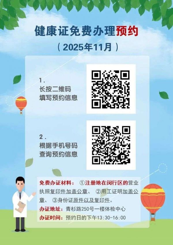 溫馨提示:微信搜索【上海本地寶】公眾號,關(guān)注后在對話框回復(fù)【閔行健康證】獲取上海閔行區(qū)健康證辦理地點(diǎn)及時(shí)間、體檢項(xiàng)目、收費(fèi)標(biāo)準(zhǔn)、免費(fèi)辦理?xiàng)l件、健康證辦理結(jié)果查詢?nèi)肟?、下載打印流程等。