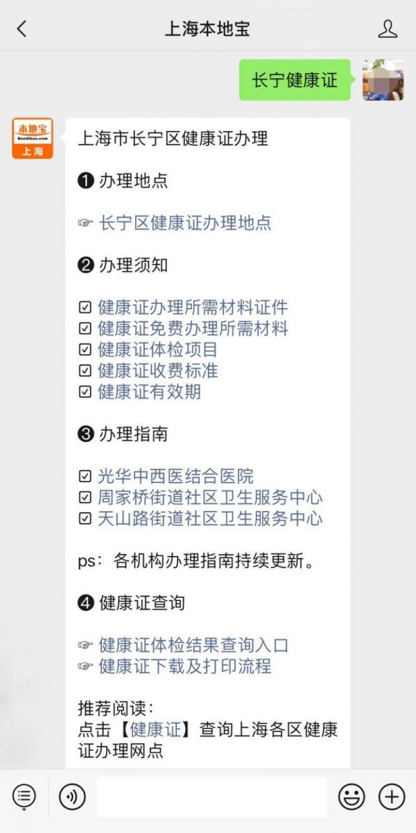 溫馨提示:微信搜索【上海本地寶】公眾號,關注后在對話框回復【長寧健康證】獲取上海長寧區(qū)健康證辦理地點及時間、體檢項目、辦理費用、免費辦理所需材料、醫(yī)院健康證辦理指南,健康證查詢入口/下載打印流程等。