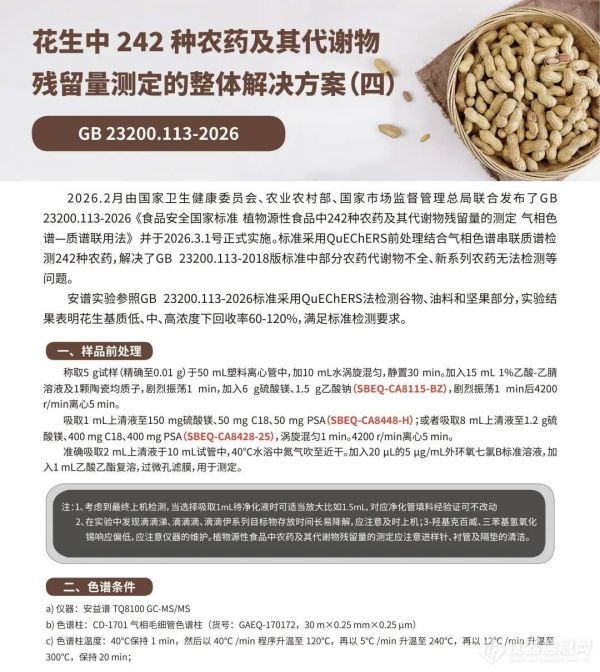 2026年3月1日,由國家衛(wèi)生健康委員會、農(nóng)業(yè)農(nóng)村部、國家市場監(jiān)督管理總局聯(lián)合發(fā)布的7項食品安全國家標準正式落地實施!本次更新的標準矩陣中,GB 23200.113-2026《食品安全國家標準 植物源性食品中242種農(nóng)藥及其代謝物殘留量的測定 氣相色譜—質(zhì)譜聯(lián)用法》尤為引人關(guān)注,標準采用QuEChERS前處理結(jié)合氣相色譜串聯(lián)質(zhì)譜檢測242種農(nóng)藥,解決了GB 23200.113-2018版標準中部分