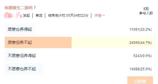盡管“全面二孩政策”已實施兩年,且二孩出生占比持續(xù)攀升,達到51%,顯示出政策效果的顯著。然而,網絡上的一項關于是否生育二胎的投票顯示,近半數人表示無法負擔二胎的養(yǎng)育成本。
