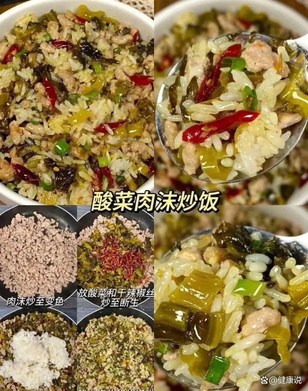 酸菜肉末炒飯帶有獨特的酸爽味,酸菜的風(fēng)味與肉末的咸香碰撞,別有一番風(fēng)味。將酸菜和肉末炒香后,再加入米飯,攪拌均勻,令人一試成主顧。