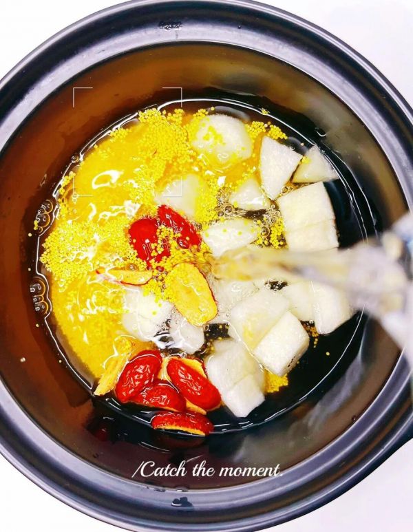 3電飯鍋里放入小米?紅棗?梨,開啟煮粥模式