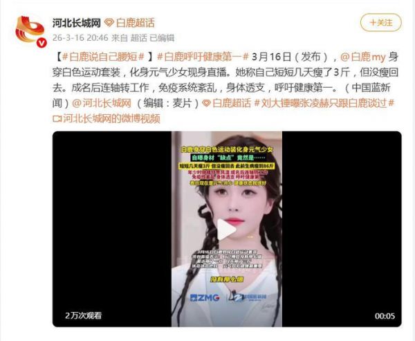 演員白鹿自曝“短短幾天瘦了三斤”,呼吁健康第一