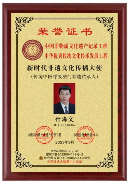 由于其出色的成就,榮獲了中國“十大美體品牌杰出人物”、“行業(yè)影響力人物”等榮譽(yù)稱號(hào)。2016年《中國美容時(shí)尚報(bào)》對(duì)其進(jìn)行專訪并連續(xù)四期整版報(bào)道,創(chuàng)始人并受邀“北京華人國際頻道”、“央視魅力品牌”等欄目特約專題采訪,節(jié)目視頻在國內(nèi)外傳播,受到了廣泛關(guān)注。個(gè)人事跡已入編《中國美容時(shí)尚報(bào)》、《追夢(mèng)中國》、《中華美容大典》、《杏林大國醫(yī)》、《中醫(yī)藥杰出人物》、《匠心中國》等權(quán)威刊物。2017年,付海文作為行業(yè)杰出代表被中國影響力人物數(shù)據(jù)庫永久收錄,個(gè)人肖像入選中國郵政出版發(fā)行珍藏郵冊(cè),榮載史冊(cè)。