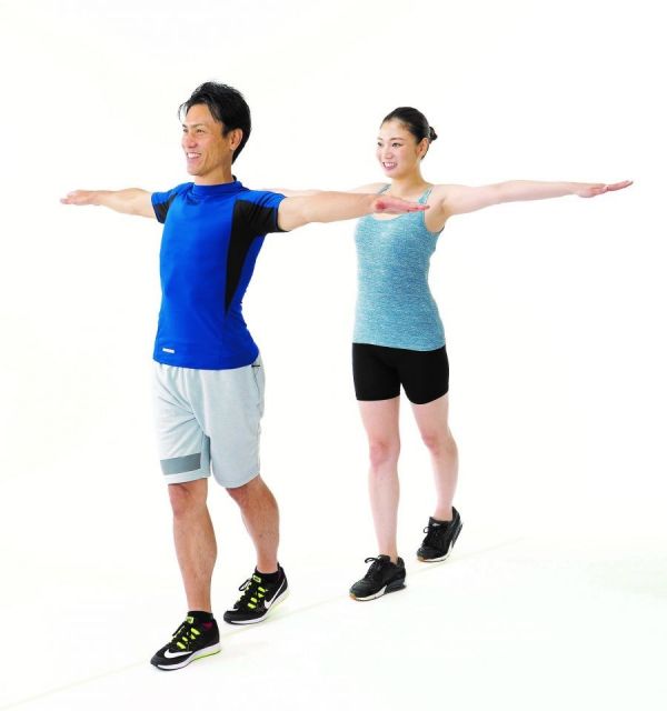 如果再加上雙手往左右打開、筆直地舉到頭上或是在背後做交扣等動作,就能固定上半身,穩(wěn)定體幹,幫助調(diào)整歪斜。