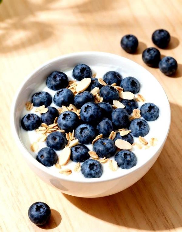 1.藍(lán)莓酸奶碗(早餐版):120克無(wú)糖酸奶 + 80克藍(lán)莓 + 20克燕麥片 + 一小撮原味堅(jiān)果。