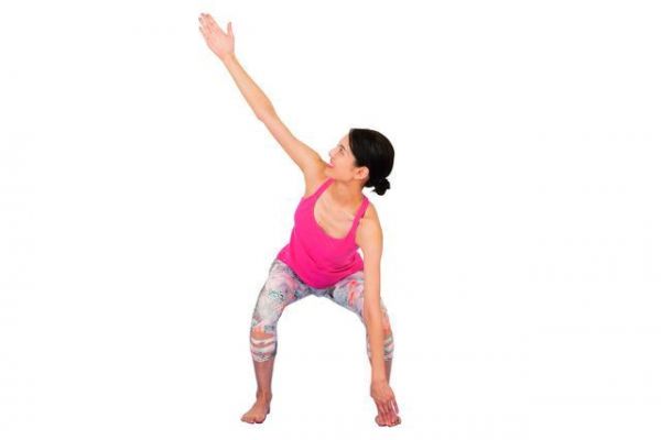 雙腳張開至與腰部同寬,挺直背脊并做出深蹲的姿勢,使雙手碰到腳尖。右手舉高至斜上45度,接著左手也一樣舉起,保持這個姿勢站起。重復(fù)進行這個動作。