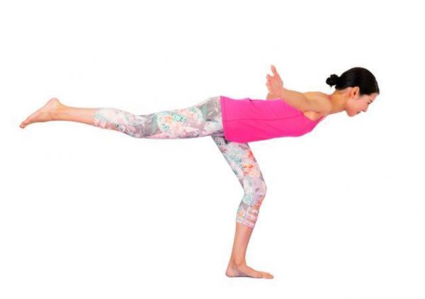 雙腳張開至與腰部同寬,挺直背脊并舉起雙臂至正側(cè)邊,大拇指在上方。傾斜上半身,左腳往后抬起,形成一條直線。左右交互進行。