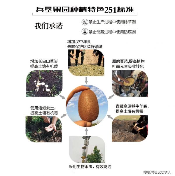 武功獼猴桃種植采用大棚架形及一主兩蔓樹形,嚴格按照國家標準、行業(yè)標準種植、生產(chǎn),著力追求“生態(tài)、健康、營養(yǎng)”三大理念?!氨鴫ü麍@”獼猴桃示范園,禁止生產(chǎn)過程中使用除草劑、禁止儲藏過程使用防腐劑。匠心種好果,吃長白山最好的草炭土,提高土壤有機質(zhì)品。漢中優(yōu)質(zhì)油菜籽油渣增加果子香甜度,喝原磨豆?jié){,汲取青藏高原牛羊糞中的營養(yǎng),還有蚯蚓為他們松土SPA,采用生物殺蟲,有效防治。